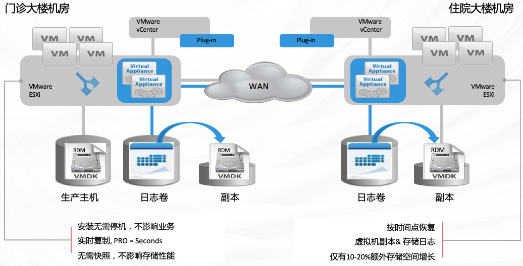 院区内两个机房需要协同保障业务陆续在性,同时要能防范因人为误操作导致 重大损失的灾难,并能决速恢复系统。