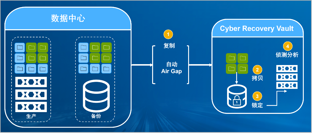 WM视讯平台 WM防勒索病毒方案将生产中心备份数据复制到Vault区,复制后网络自动断开实现弹性隔离。Vault区的数据快速拷贝,并对拷贝版本加锁(在锁定期数据不允许删除和修改)。Vault沙箱内对拷贝版本进行扫描分析,验证数据是否完好。